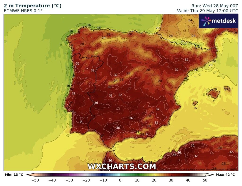 No centro, Coimbra deverá registar 31 °C de máxima e 16 °C de mínima; Leiria com 31 °C de máxima e 15 °C de mínima; Castelo Branco com 36 °C de máxima e 19 °C de mínima; e Santarém com 38 °C de máxima e 20 °C de mínima.