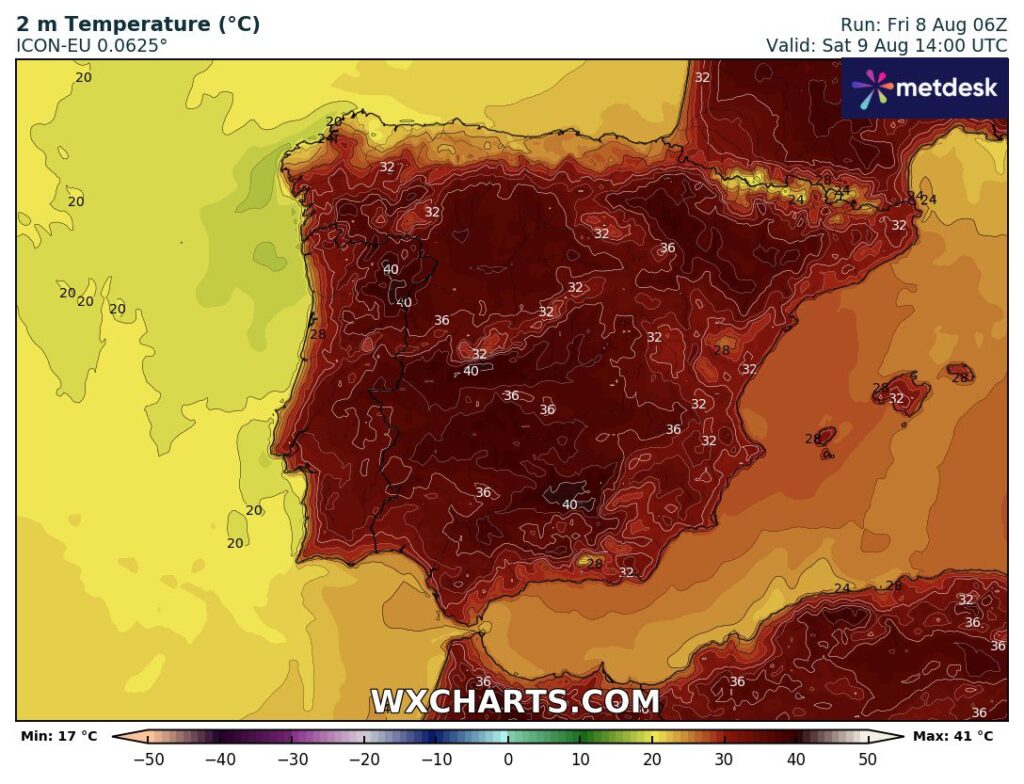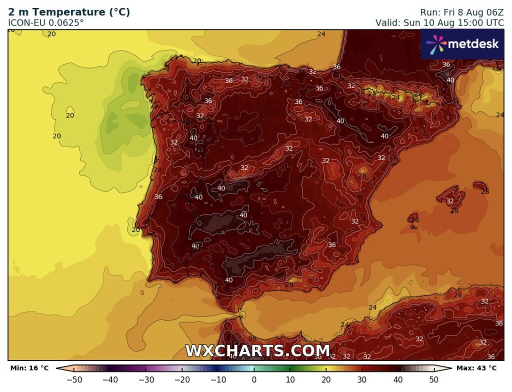 Quanto às temperaturas máximas, espera-se que atinjam os 27°C em Aveiro e Viana do Castelo, 29°C no Porto, 32°C em Faro, 33°C em Leiria e Guarda, 34°C em Setúbal, 35°C em Coimbra e Braga, 36°C em Lisboa, 37°C em Viseu, 38°C em Santarém e Portalegre, 39°C em Beja e Vila Real, 40°C em Bragança, e 41°C em Évora e Castelo Branco.