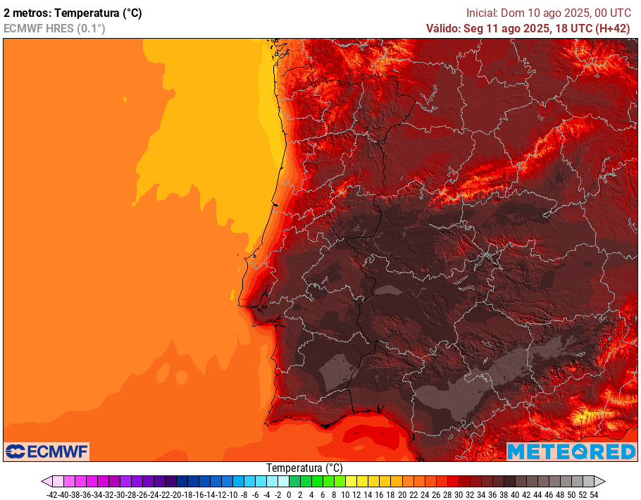 Quanto às temperaturas máximas, espera-se que atinjam os 25°C em Viana do Castelo, 26°C em Aveiro, 28°C no Porto, 33°C em Braga e Leiria, 34°C na Guarda, 35°C em Coimbra, 36°C em Faro, Vila Real e Viseu, 38°C em Bragança, Portalegre e Santarém, 39°C em Setúbal, 40°C em Lisboa, 41°C em Castelo Branco e 42°C em Évora e Beja.