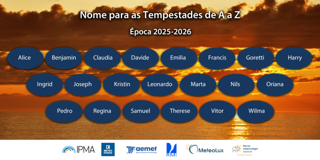 Iniciou-se nesta semana a época 2025/2026 de tempestades extratropicais na Europa, tornando-se oficialmente ativa no grupo sudoeste, no qual Portugal está incluído através do Instituto Português do Mar e da Atmosfera (IPMA). A lista completa de nomes selecionados para esta temporada já se encontra definida e é divulgada na figura abaixo, sendo a referência para todas as tempestades que venham a cumprir os critérios de nomeação nos próximos meses.