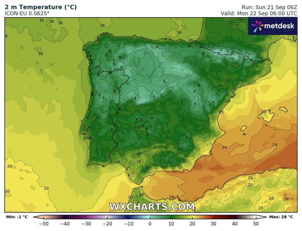 Quanto à temperatura máxima, espera-se que atinja os 28°C em Beja, Évora e Santarém, 27°C em Faro, Setúbal e Lisboa, 26°C em Leiria e Braga, 25°C em Castelo Branco e Coimbra, 24°C em Portalegre, 23°C no Porto, Vila Real e Viseu, 22°C em Viana do Castelo e Bragança, 21°C em Aveiro e 18°C na Guarda.