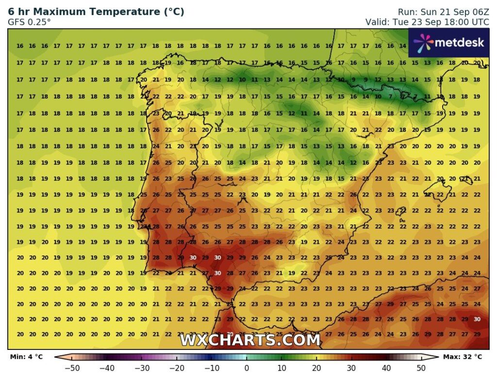 Quanto à temperatura máxima, espera-se que atinja 30°C em Évora e Santarém, 29°C em Beja, Setúbal, Lisboa e Leiria, 28°C em Coimbra, 27°C em Braga, 26°C em Faro, Portalegre, Castelo Branco e Porto, 25°C em Aveiro, 24°C em Viana do Castelo e Viseu, 23°C em Vila Real, 22°C em Bragança e 20°C na Guarda.