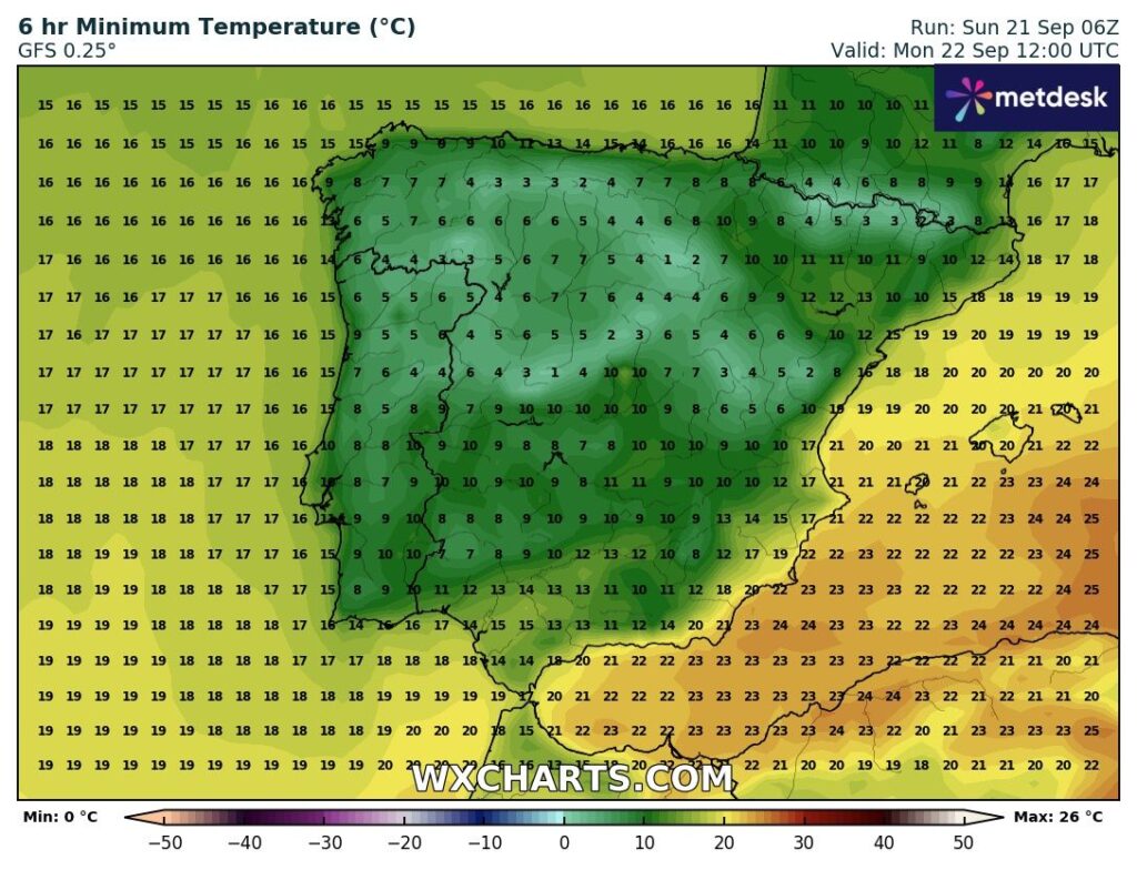Prevê-se que a temperatura mínima seja de 6°C na Guarda, 7°C em Bragança, 8°C em Leiria, 9°C em Vila Real, 10°C em Coimbra, 11°C em Setúbal, Braga e Viseu, 12°C em Évora, Santarém, Aveiro e Viana do Castelo, 14°C em Beja e Castelo Branco, 15°C em Lisboa, Portalegre e Porto, e 17°C em Faro.