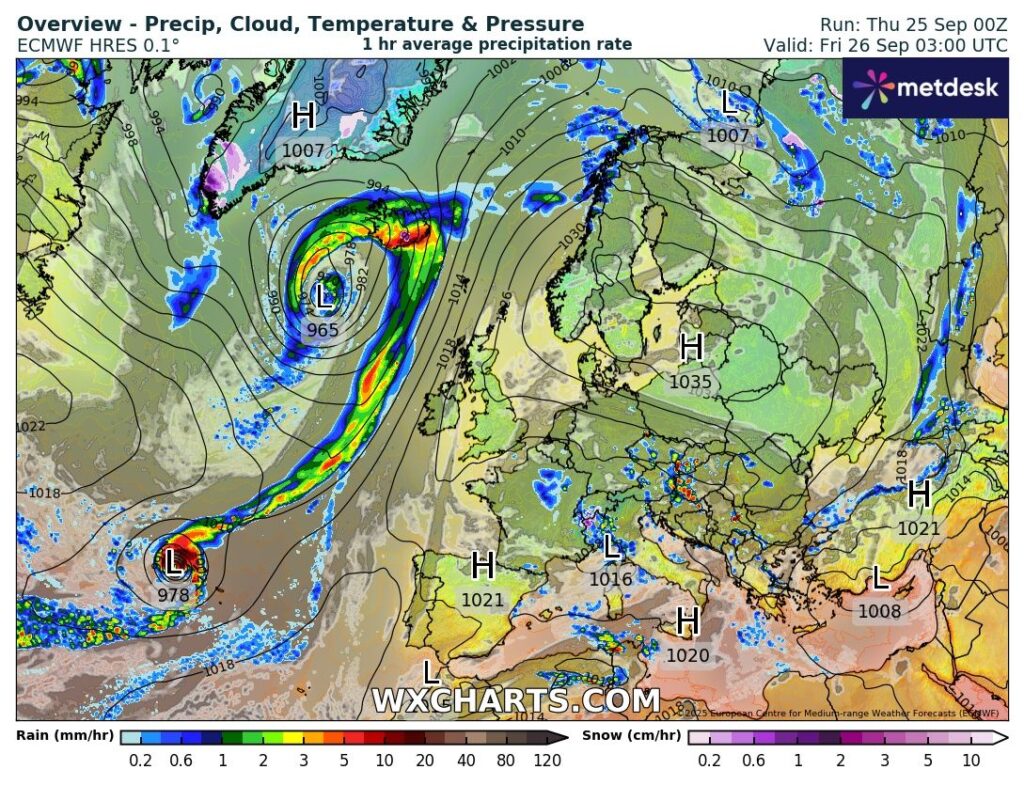 Hoje, dia 24 de setembro, às 12:00UTC, o ciclone tropical Gabrielle encontrava-se em 36°N 50°W, com uma pressão mínima no seu centro de 962hPa, de acordo com a informação disponibilizada pelo National Hurricane Center (NHC).