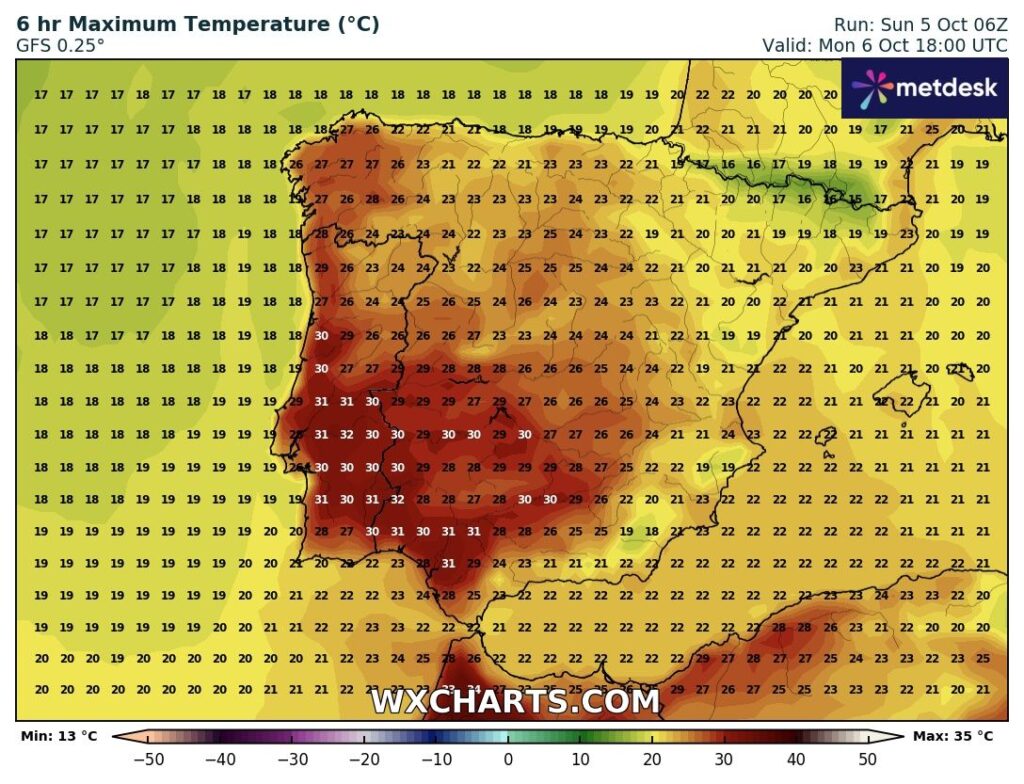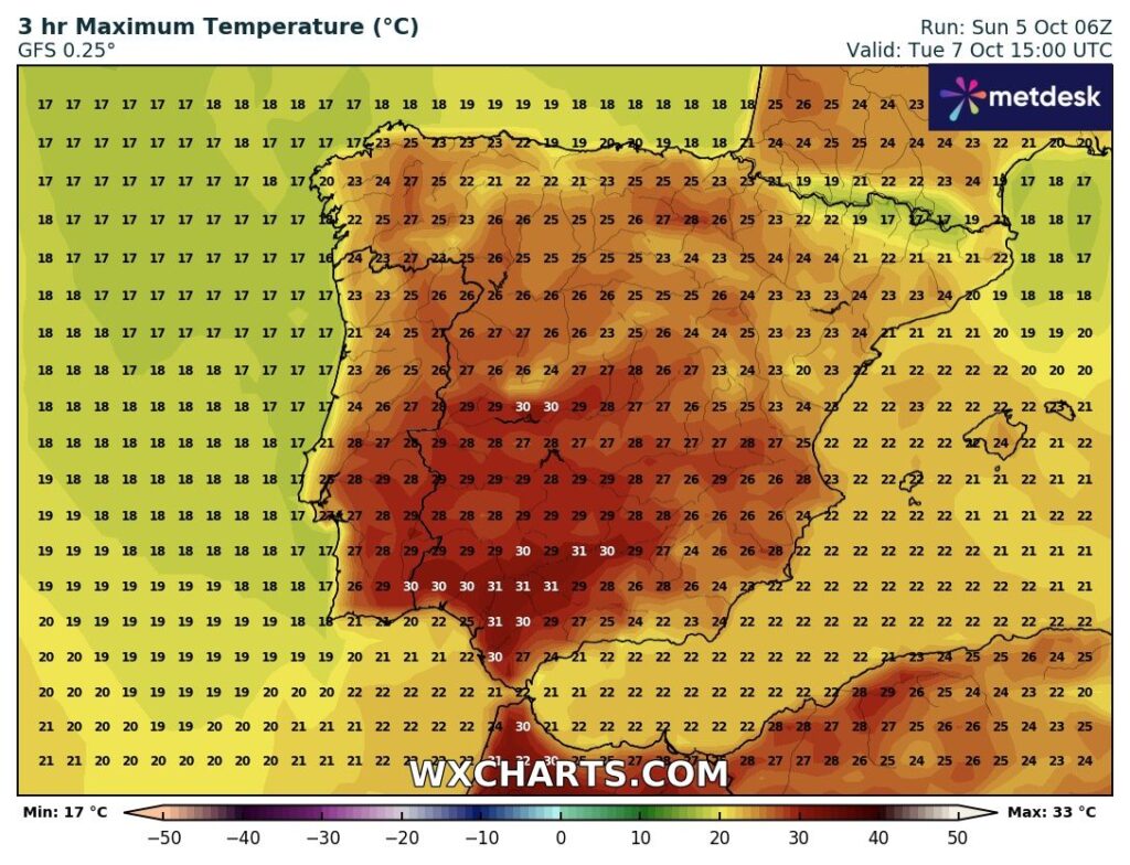 Quanto às temperaturas máximas, espera-se que atinjam 30 °C em Beja e Évora, 29 °C em Castelo Branco, 28 °C em Santarém e Bragança, 27 °C em Faro, 26 °C em Setúbal, Lisboa, Portalegre, Vila Real e Viseu, 25 °C em Braga, 24 °C em Coimbra e Guarda, 23 °C em Leiria, 21 °C em Aveiro e Porto, e 20 °C em Viana do Castelo.