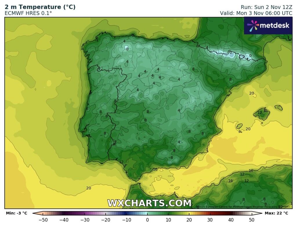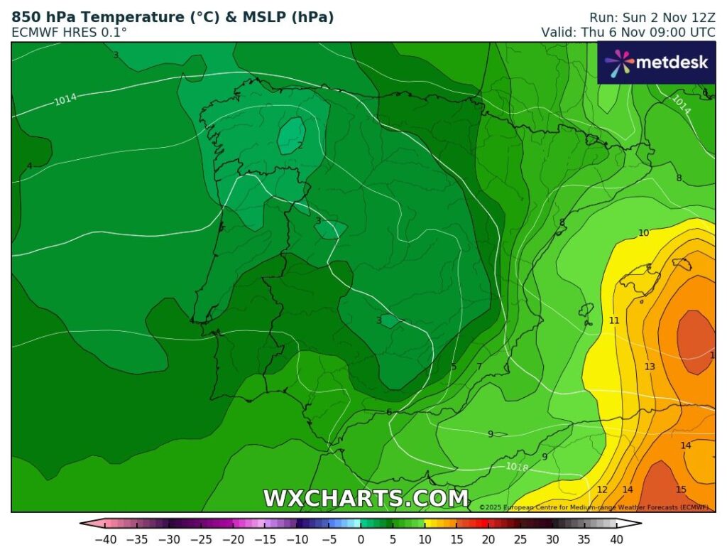 Novembro inicia-se com um misto meteorológico, marcado por alguns períodos de sol, precipitação especialmente entre terça e quarta-feira e entrada de ar frio na quarta. As temperaturas vão descer significativamente a partir da noite de quarta-feira.