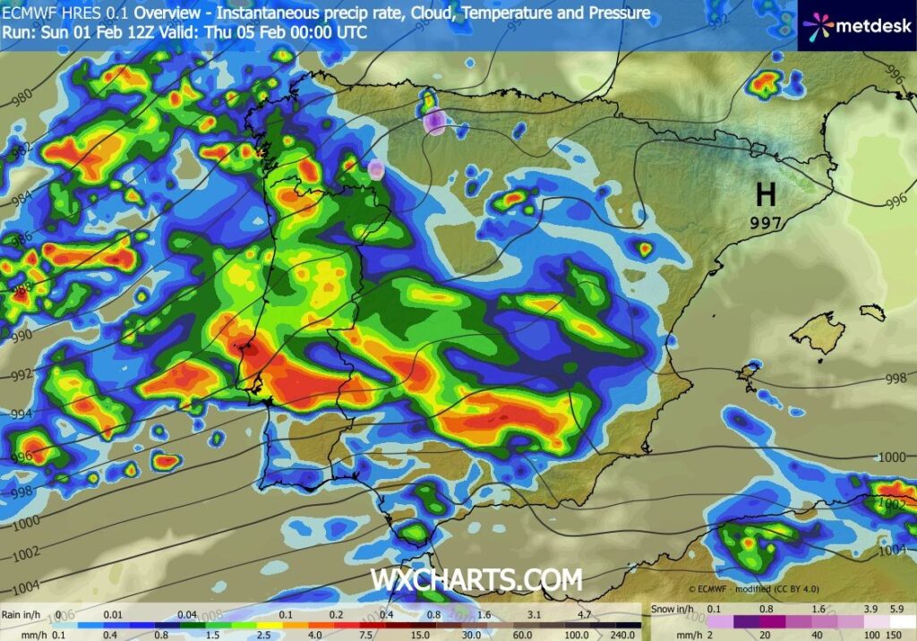 Entre quarta-feira e quinta-feira espera-se um novo período bastante chuvoso, a começar pelo centro e sul na quarta-feira onde os períodos de chuva deverão ser localmente intensos e persistentes, estendendo-se a todo o território na madrugada de quinta-feira. A temperatura deverá subir, em especial a mínima, no centro e sul. Ao longo do dia de quinta-feira, esperam-se mais abertas e condições para a ocorrência de aguaceiros por vezes fortes, de granizo e acompanhados de trovoadas em qualquer local. Para o final do dia poderá haver queda de neve acima dos 1400/1600 metros de altitude. O vento continuará moderado a forte, no litoral e nas terras altas, com rajadas que podem atingir 90 km/h.