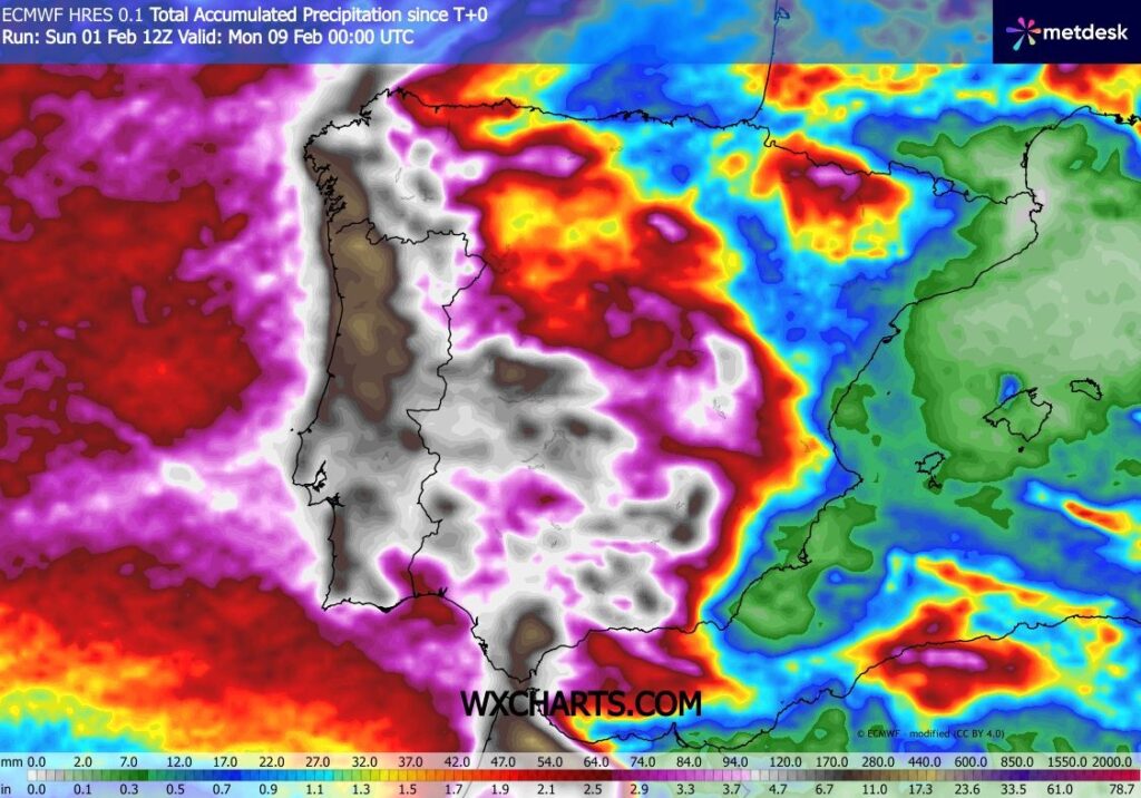 O risco de cheias é muito elevado ao longo desta semana. A continuação da chuva intensa e persistente, as descargas controladas das barragens para aumentar a sua capacidade de encaixe e a saturação dos solos, criam as condições ideais para a subida significativa dos caudais dos rios e seus afluentes de norte a sul do país. As atuais projeções apontam para acumulados totais de precipitação até ao final da semana que podem atingir os 300 a 400 mm no Minho e Douro Litoral, cerca de 200 a 300 mm na região Centro, 150 a 200 mm na região de Lisboa, Oeste, Vale do Tejo e Alentejo,100 a 150 mm no Algarve e 90 a 120 mm no nordeste transmontano.