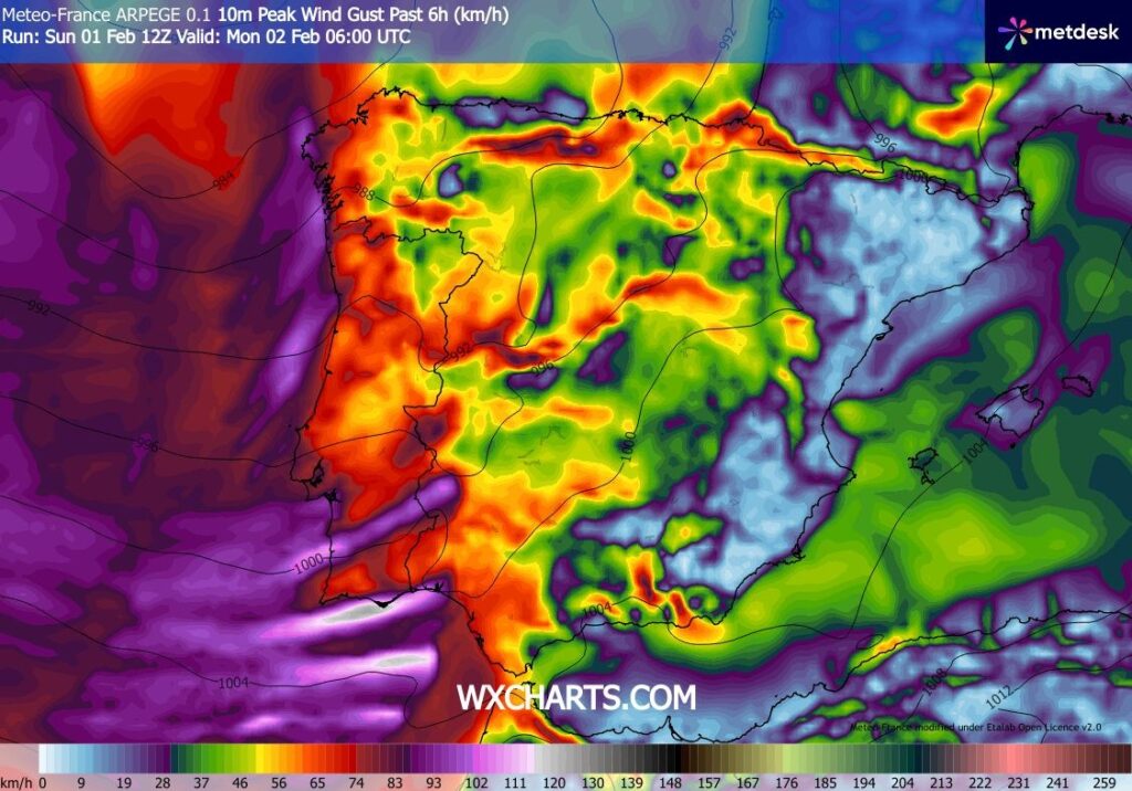 Para a madrugada desta segunda-feira está previsto um novo agravamento das condições meteorológicas de norte a sul, com a passagem de 2 frentes frias de forte atividade, originando chuva intensa e persistente, podendo ser acompanhada de trovoada, e vento forte com rajadas muito intensas à sua passagem. O pico da precipitação deverá acontecer entre as 0h e as 6h, assim como o da intensidade do vento que poderá ter rajadas até 100 a 110 km/h no litoral e nas serras. A partir do início da manhã, o regime de pós-frontal vem com aguaceiros frequentes e por vezes intensos acompanhados de trovoada e granizo. A queda de neve deverá ser significativa nas terras altas do Norte e Centro, inicialmente apenas nos pontos mais altos da Serra da Estrela, baixando a cota para os 800 a 1000 metros de altitude ao longo do dia com a entrada de uma massa de ar mais frio. A partir do meio da tarde o vento deverá enfraquecer em todo o território.