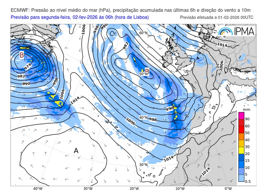 O padrão atmosférico nesta semana vai continuar muito instável, à semelhança da semana anterior. Vai continuar a predominar uma forte corrente perturbada de oeste originada pela conjugação da posição do anticiclone dos Açores, a sul do arquipélago, e pela formação de várias depressões complexas e intensas no Atlântico Norte. Um bloqueio de altas pressões no Ártico força a corrente de jacto a descer em latitude até à península ibérica, fazendo com que os diversos sistemas frontais associados às depressões atlânticas se desloquem em direção ao território. Esta corrente de oeste continua a transportar massas de ar muito húmidas, com elevado conteúdo em vapor de água, alternando com massas de ar mais frio, gerando condições de forte instabilidade atmosférica. Deste modo, prevê-se a ocorrência de regimes de precipitação por vezes intensa e persistente, mais significativa nas regiões do norte e centro e em particular nas zonas montanhosas. O vento irá soprar predominantemente do quadrante oeste/sudoeste por vezes forte, com rajadas muito fortes, em especial no litoral e nas regiões montanhosas sobretudo à passagem das frentes mais intensas. Está prevista uma descida das temperaturas no início da semana, voltando a subir a meio da semana e com tendência a estabilizar até ao fim de semana. Também é de esperar queda de neve entre 2ª feira e 4ª feira nas terras altas a cotas acima dos 800 a 1000 metros de altitude, subindo depois para os pontos mais altos da Serra da Estrela até ao final da semana.