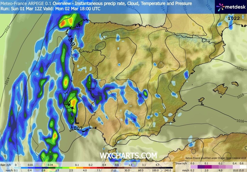 A semana vai começar com instabilidade atmosférica devido à formação de uma depressão isolada em altitude que vai condicionar o estado do tempo em Portugal continental a partir desta segunda-feira. Este dia de segunda-feira vai ser marcado por períodos de céu muito nublado de norte a sul, algumas abertas, possibilidade de aguaceiros e trovoadas que podem ser mais intensos e frequentes durante a tarde e início da noite. Espera-se que as regiões do centro e sul sejam mais afetadas pela instabilidade mais significativa. A temperatura máxima vai descer acentuadamente, em contrapartida com a temperatura mínima que vai subir. Vento fraco a moderado do quadrante sul, soprando por vezes forte com rajadas da ordem dos 60 km/h nas terras altas, rodando gradualmente para o quadrante leste. Devido a este fluxo de vento vão surgir novamente poeiras em suspensão, em especial no interior.