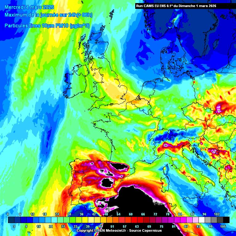 Na quarta-feira mantêm-se as condições de instabilidade, em especial no centro e no sul, com aguaceiros e trovoadas localizadas mais prováveis no período da tarde. Com o vento a continuar a soprar do quadrante leste, a concentração de poeiras em suspensão vai aumentar ainda mais neste dia em todo o continente, esperando-se que seja o dia com a concentração mais elevada de partículas finas inaláveis PM10.