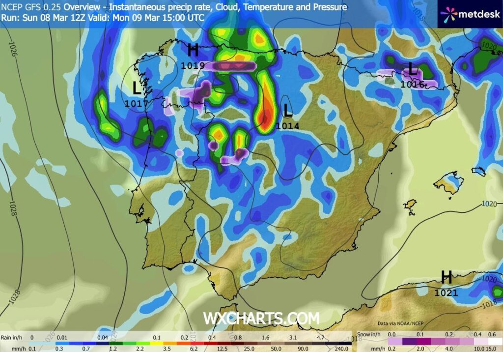 Este dia de segunda-feira vai ser marcado por períodos de céu muito nublado de norte a sul, algumas abertas, possibilidade de ocorrência de aguaceiros, que localmente podem ser de granizo e acompanhados de trovoadas em especial nas regiões do norte e centro. Devido à entrada uma bolsa de ar frio associada à depressão em altitude, prevê-se ainda queda de neve acima dos 1400/1600 metros de altitude, descendo gradualmente a cota para os 600/800 metros no norte e centro ao longo da tarde. Para o final do dia, poderá ocorrer também queda de neve nos pontos mais altos das serras de São Mamede (distrito de Portalegre) e de Monchique (no Algarve) à passagem de aguaceiros mais intensos. A temperatura vai descer de forma significativa, sobretudo a temperatura máxima, em especial nas regiões do norte e centro. Com o gradual aumento da intensidade do vento ao longo do dia, soprando moderado a forte no litoral e nas terras altas, a sensação térmica vai ser reduzida sobretudo com o anoitecer.