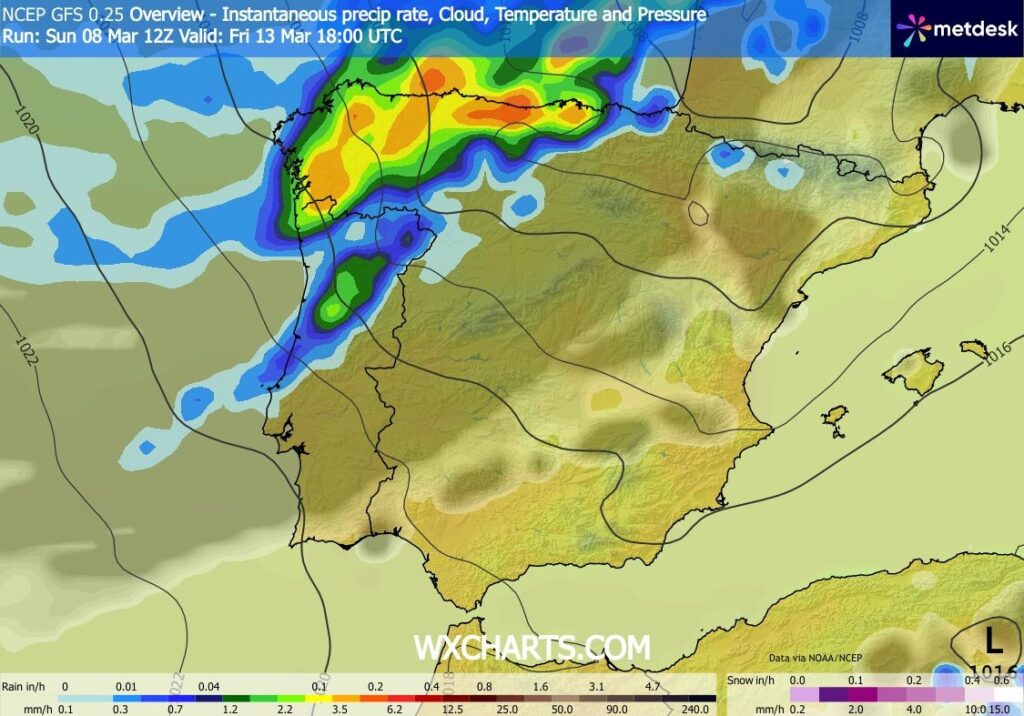 A partir do final da manhã de sexta-feira, o anticiclone deverá enfraquecer e permitir a passagem de um novo sistema frontal de norte para sul de atividade moderada. A partir do início da tarde, espera-se a ocorrência de períodos de chuva moderada a forte na região norte, fraca a moderada no centro e em geral fraca e dispersa na região sul, passando a regime de aguaceiros durante a noite e madrugada de sábado. A temperatura deverá descer, em especial a máxima, e o vento vai rodar para noroeste soprando moderado a forte a partir da tarde no litoral e nas terras altas.