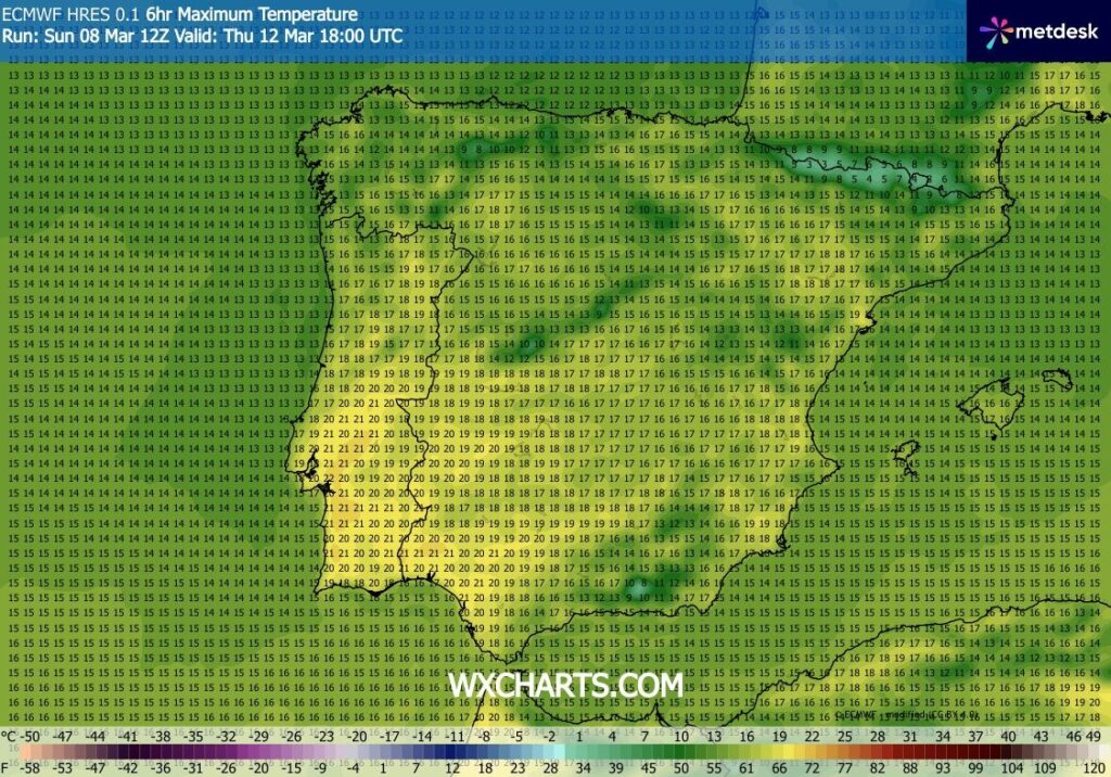 Para os dias de quarta-feira e quinta-feira, o anticiclone dos Açores deverá exercer maior influência no continente ao estender-se em crista até à Península Ibérica. Deste modo, é de esperar céu pouco nublado ou limpo em ambos os dias, por vezes mais nublado em alguns momentos. A temperatura vai subir, sobretudo a máxima, para valores considerados normais para o mês de Março. No entanto, as temperaturas mínimas vão permanecer baixas com acentuado arrefecimento noturno e possibilidade de formação de gelo ou geada em alguns locais do interior norte e centro. Em relação ao vento, deverá soprar fraco a moderado do quadrante norte/nordeste.
